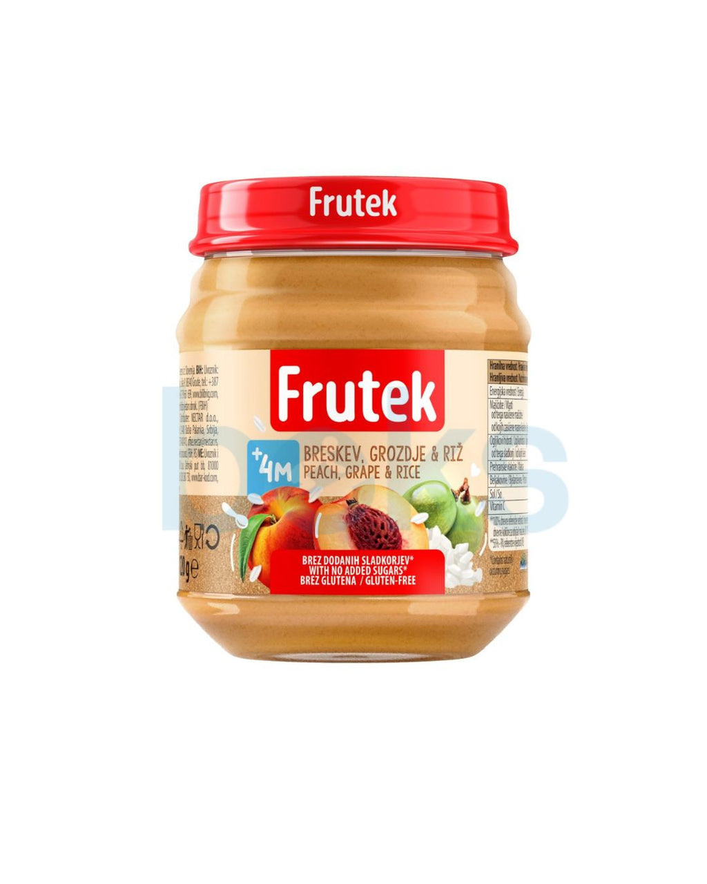 Frutek Peach, Grape & Rice (120g) is a smooth, nutritious fruit puree blended with rice—perfect for babies starting on solids. Made with real fruit and no added sugar, it's a tasty and healthy snack for little ones on the go