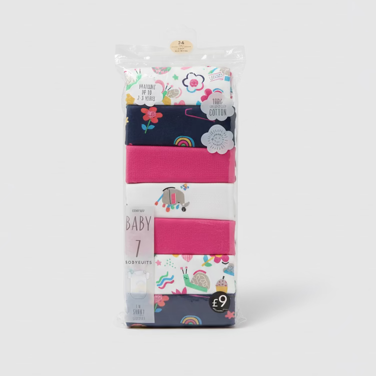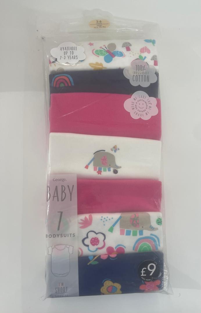 Keep your baby comfortable and cute with the George Baby 7-pack of babysuits, designed for ages 3-6 months. Made from soft, breathable cotton, these suits feature easy snap-button closures for quick diaper changes.