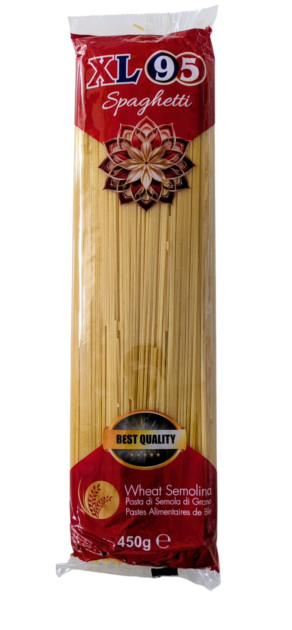Delight in hearty, flavourful pasta with the XL 95 Spaghetti 450g a satisfying bundle of long-cut spaghetti perfect for family meals. Crafted from high-quality wheat, this 450 g pack ensures you’ve got enough to serve multiple portions or revisit a favourite dish. Ideal for spaghetti Bolognese, carbonara, or simply tossed with olive oil and garlic.
